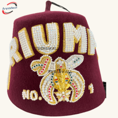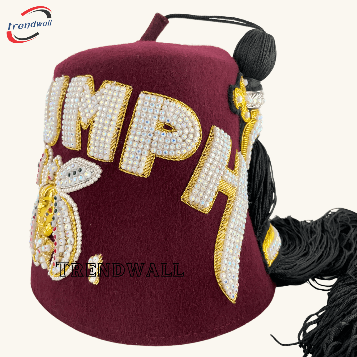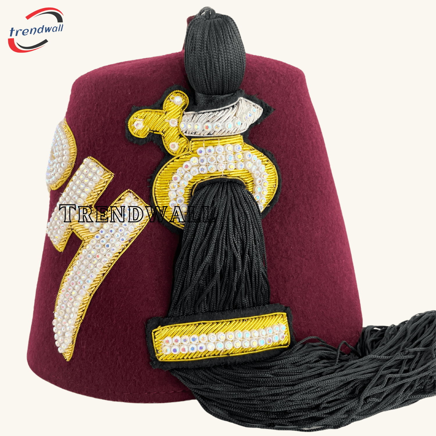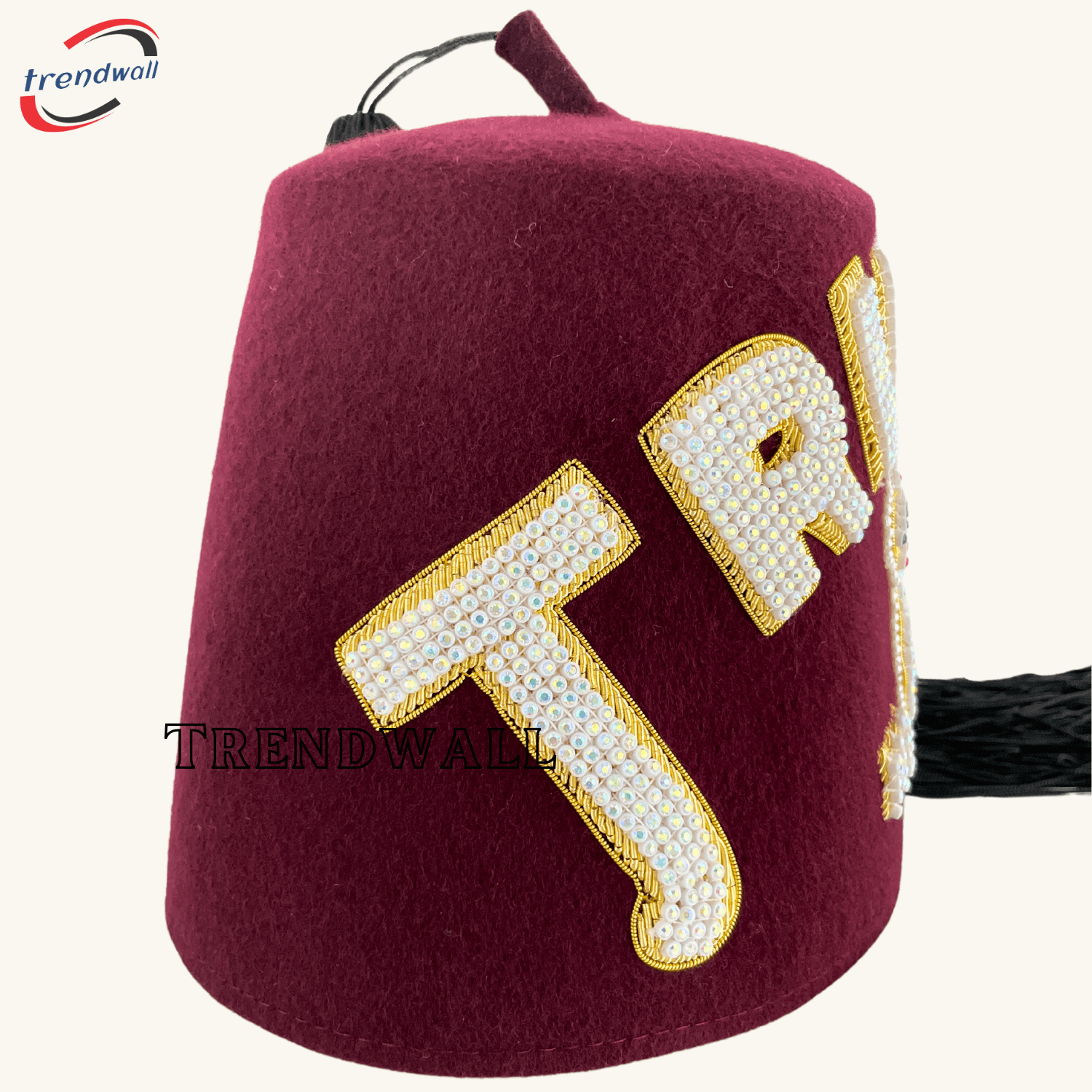 Introducing our premium Custom Burgundy Masonic Shriner Fez Hat, 100% pure wool. This elegant fez is meticulously hand-embroidered by expert artisans at Trendwall Company, renowned for their exceptional craftsmanship in Masonic regalia. Personalize your fez with your temple name, number, or any details of your choice.